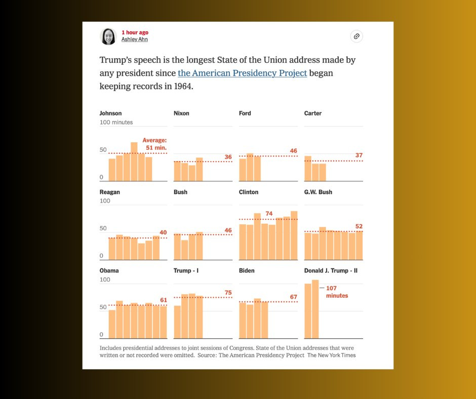Dài 107 phút, bài phát biểu của ông Trump năm nay là diễn văn Thông điệp Liên bang dài nhất do bất kỳ tổng thống nào thực hiện theo thống kê kể từ năm 1964. Nhiều đời tổng thống chỉ nói trên dưới 50 phút, nghĩa là bằng một nửa ông Trump.